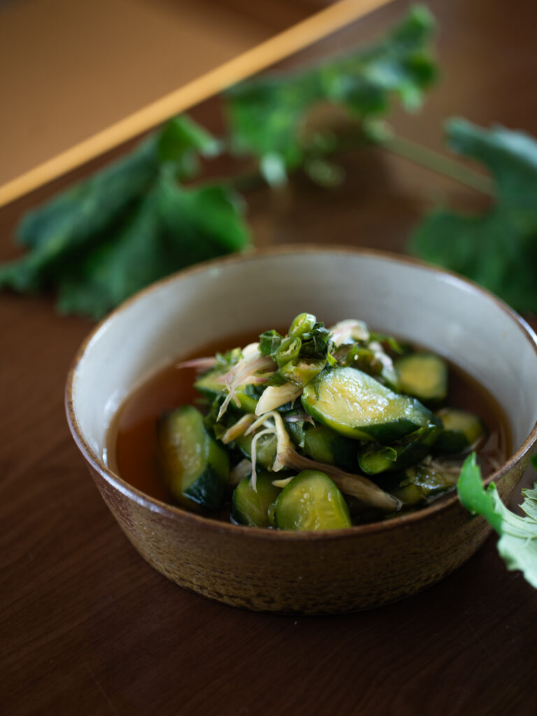 ■材料きゅうり:3本塩もみの塩:(分量外)みょうが:(あれば)青紫蘇:適量青唐辛子:1本(辛さが気になるときは種をとると控えめになる)三杯酢:(酢大さじ3・砂糖大さじ2・醤油大さじ1)