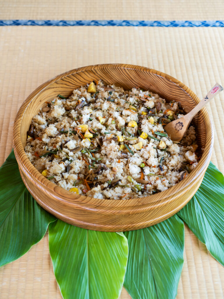 ■作り方①もち米を洗って浸水させる。栗はむいておく。蒸し器のお湯を沸かす。②水で充分に濡らした蒸し布にもち米と栗を包み、30分ほど蒸す。③フライパンに油(分量外)を熱してAを炒め、みりんと砂糖、醤油で味をつける。④蒸したもち米と栗を布巾ごと木桶に移し、炒めた具の半分を混ぜる。⑤もち米と栗を布巾ごと蒸し器に戻し、さらに15分ほど蒸す。⑥もち米を味見して硬さがほどよければ木桶に移し、残りの具とむき枝豆を混ぜる。