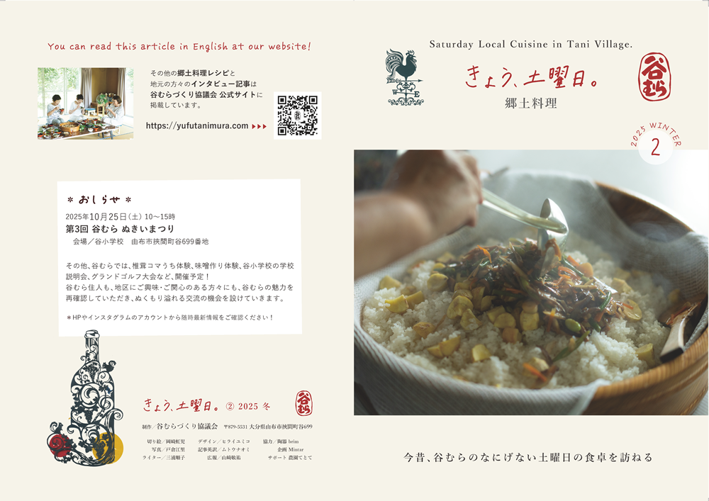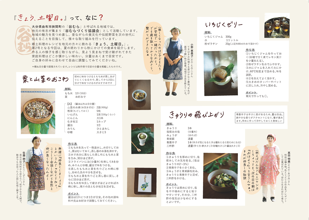 大分県由布市挾間町の「谷むら」と呼ばれる地域では、地元の有志が集まり「谷むらづくり協議会」として活動しています。地域の魅力を見つめ直し、昔ながらの食文化や伝統野菜を次の世代に伝えることを目指して、さまざまな取り組みを行っています。郷土料理のレシピを地元の方々に教わる「きょう、土曜日」。第2号となる今回は、夏の終わりから秋にかけての食卓に注目しました。家庭で受け継がれてきた、どこか懐かしい味わいのお料理を紹介します。