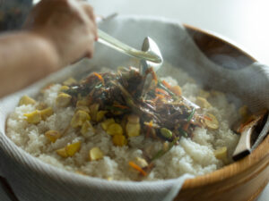 谷むらは山の幸が豊富な地域です。春になるとお散歩がてら、通り沿いでわらび狩り。上手に採れば若芽が出続けるのもち米と具を混ぜる静子さんで、名人は7月まで収穫するそうです。この山菜おこわには、恵美子さんが採って乾燥させた貴重なぜんまいも入っています。でも3人は「材料はあるものでいいんよ。山菜の水煮パックでも大丈夫」と笑います。