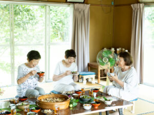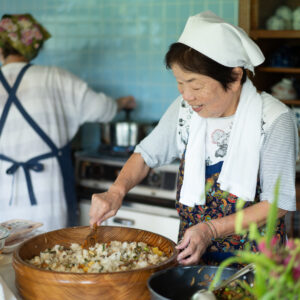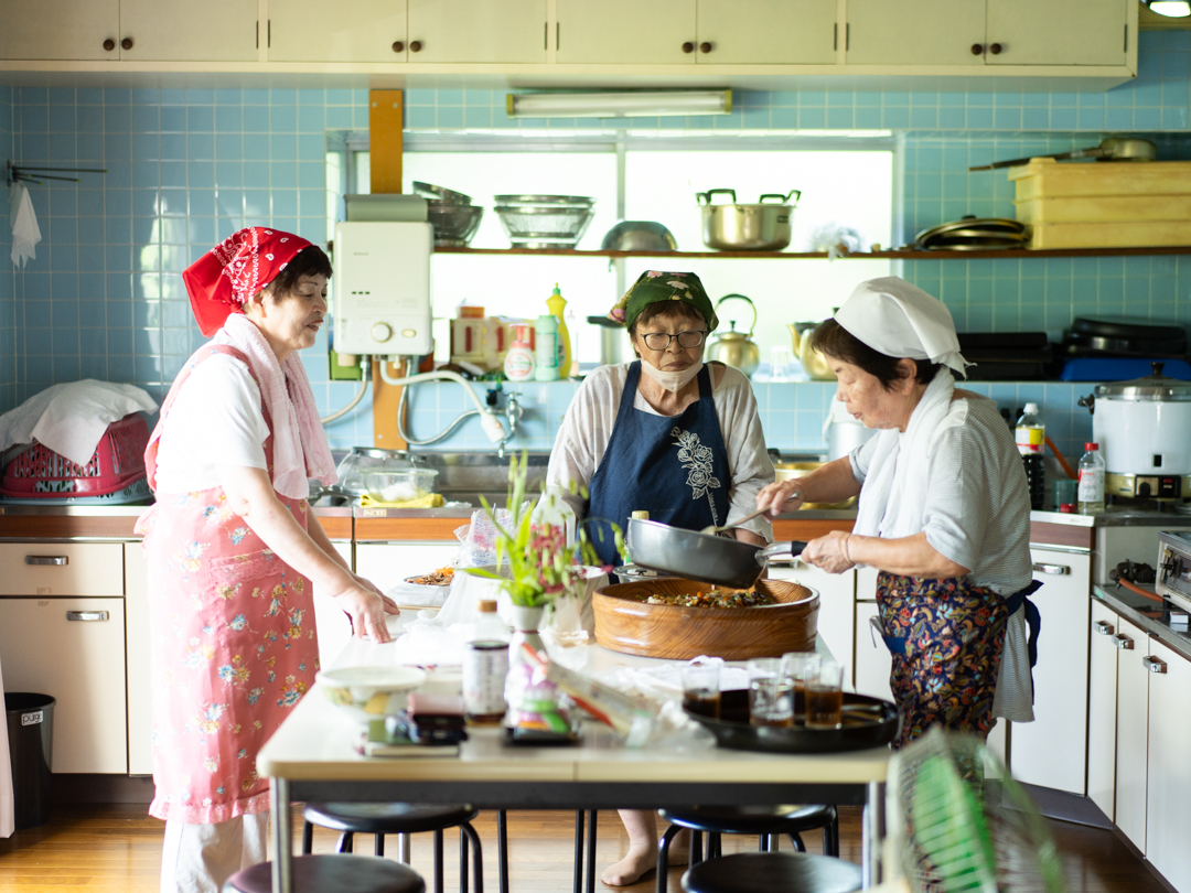 道路沿いに建つ公民館は緑に包まれ、小さなおうちのようにたたずんでいました。ガラガラと引き戸を開けると、台所はとてもにぎやか。笑い声を響かせながら、女性たちがわいわいお料理をしています。