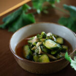 「飛び上がり、食べてみてー」と、きゅうりを差し出してくれたのは、なごみ系の明美さん。飛び上がるほど美味しいのかと思いきや「辛くて飛び上がりそうになるから、飛び上がり」なのだそう。恐る恐る食べてみると、ん?そんなに辛くない。みょうがと青紫蘇は爽やかで、三杯酢の甘みが絶妙。しゃきっと冷えた厚みのあるきゅうりをパリパリ噛むと…きたきた!おお、辛いっ!でも、青唐辛子のいい香り。これはやみつきの味です。