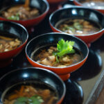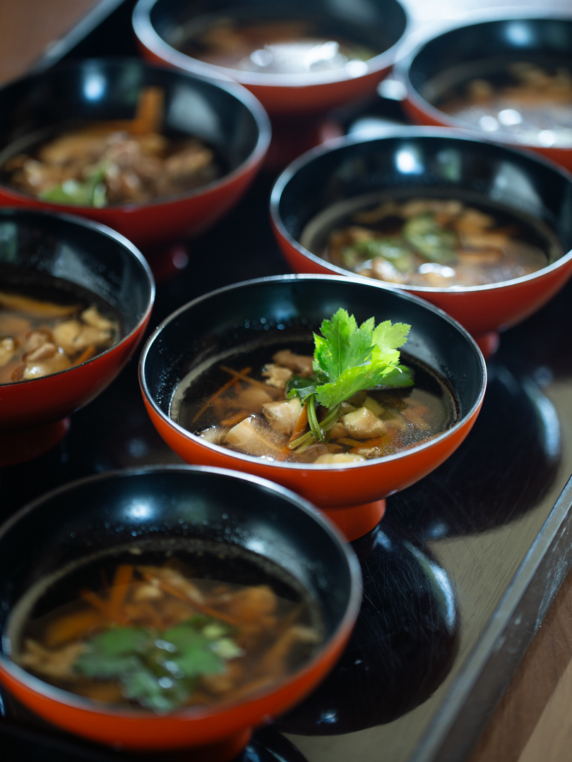おこわに入れようと用意していた親鶏のこまぎれは、臨機応変にお吸い物に使うことになりました。汁椀を見ながら「青みがないなぁ」と静子さんがつぶやくと、恵美子さんは玄関先を探索。「なにかあった気がする。ほら」手を伸ばした先には、ミツバが茂っていました。軸をくるっと結んで飾ると、おもてなしにもぴったりです。