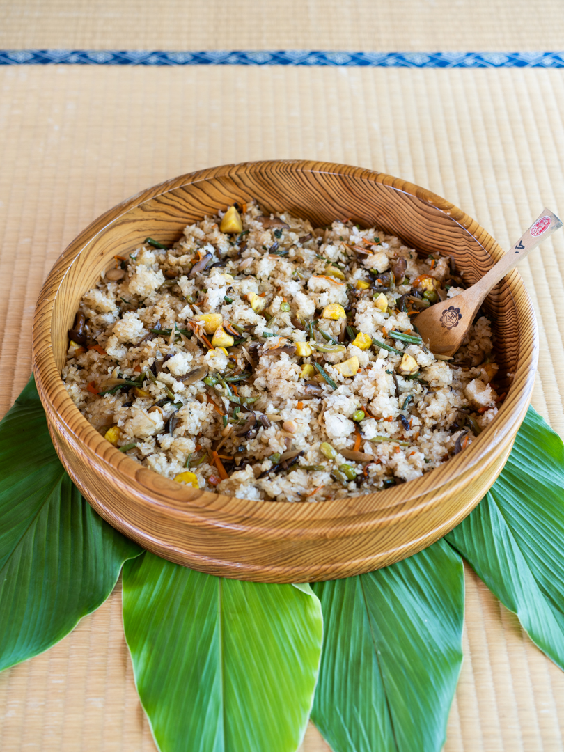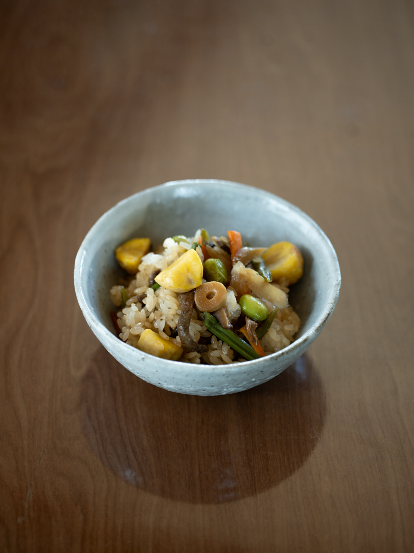 噛んでみると、まだ少し硬めです。栗おこわに半分の具を混ぜ込み、さらに15分ほど蒸したあと、残りの具を加えれば山菜おこわの完成。甘辛い味がしっかり染み込み、散りばめられた栗や枝豆がうれしい。おかずがいらない、立派なごちそうが出来上がりました。